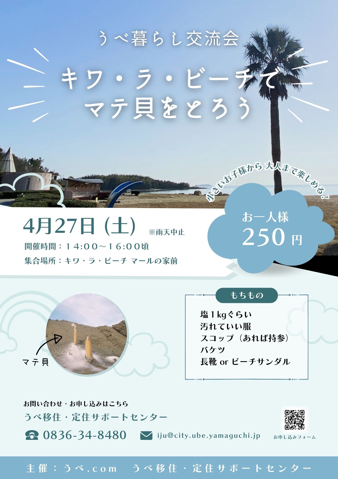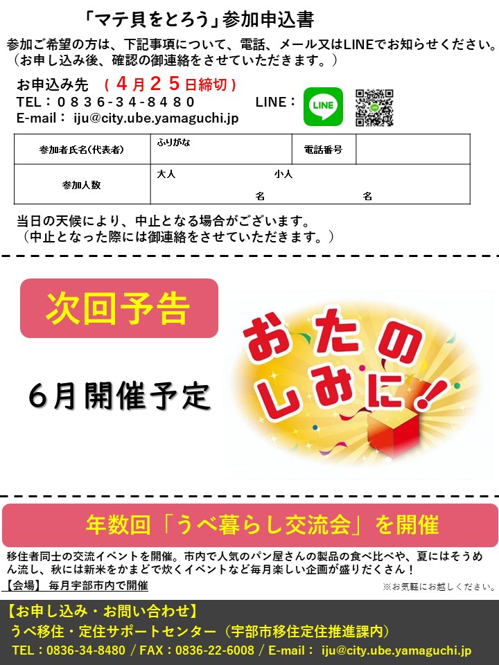 「うべ暮らし交流会」→4月のイベントは、キワ・ラ・ビーチでマテ貝とり♪ 2024.04.17 毎回大好評の「うべ暮らし交流会」♪ 4月のイベントは、「マテ貝とり」 潮干狩りの名所としても人気のキワ・ラ・ビーチで、 ニョキっと顔を出すマテ貝を楽しみながら捕まえてみませんか? ぜひお気軽にどうぞ 皆様のご参加、お待ちしております★ 戻る
